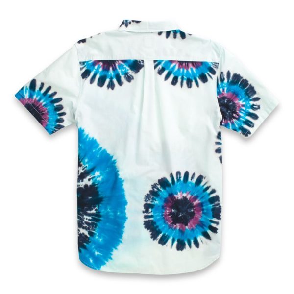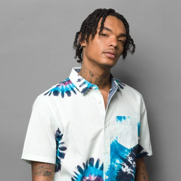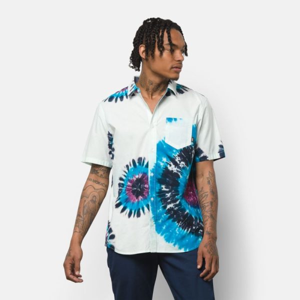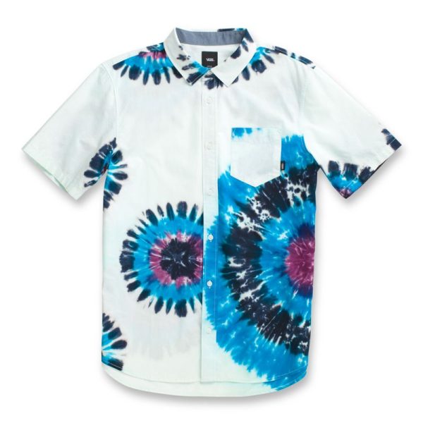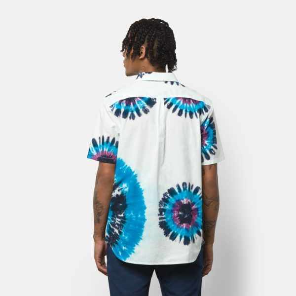 The Vans Tie Dye Shirt is a 100% BCI cotton buttondown woven shirt with short sleeves, an allover tie-dye, and a chest pocket. Model is 6 feet tall and wearing a size Medium.