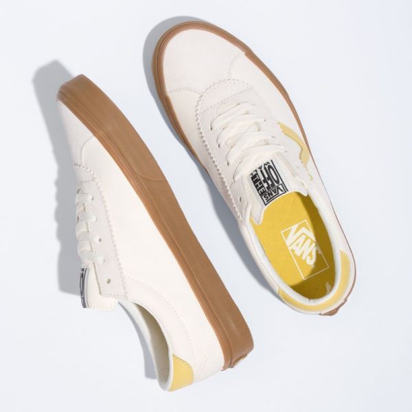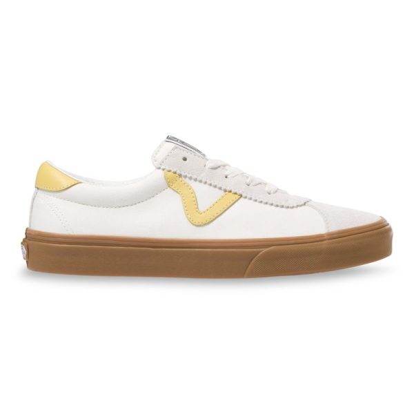 The Gum Vans Sport is a retro lace-up style featuring sturdy canvas uppers with suede accents and gum-colored sidewalls. It also includes old school V sidestripes, padded collars, and signature rubber waffle outsoles.