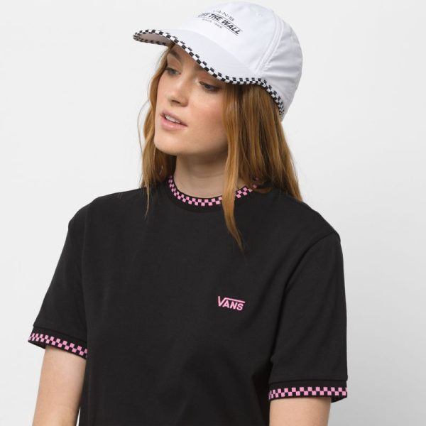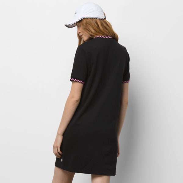 The All Stakes Dress is a 100% cotton short sleeve t-shirt dress with jacquard flat knit ribbing at the neck, sleeve cuffs, and chest logo embroidery. Model is 5 feet 9 inches tall and wearing a size Small.