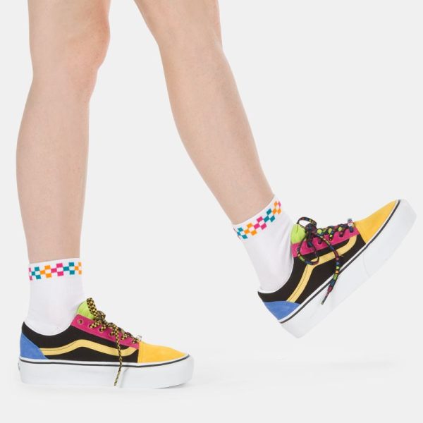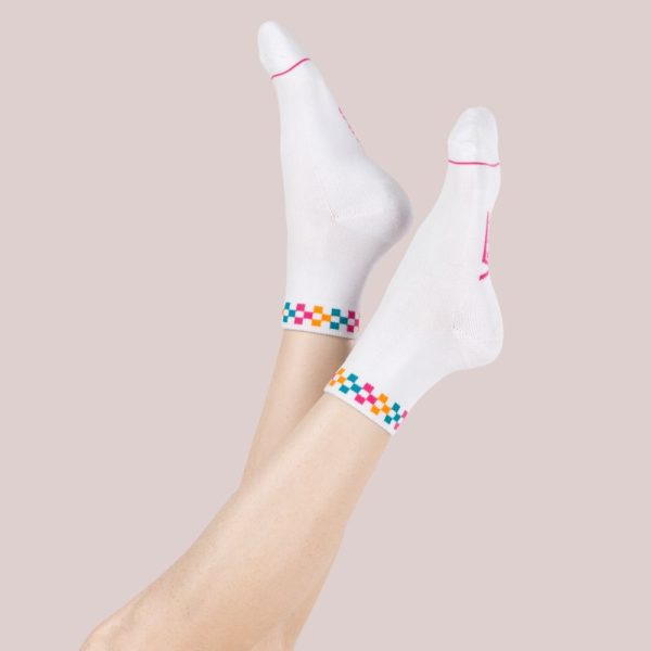 The Peek-A-Check Crew Sock is a 79% cotton, 20% nylon, and 1% elastane wide rib crew sock with a low height and checkerboard jacquard art.