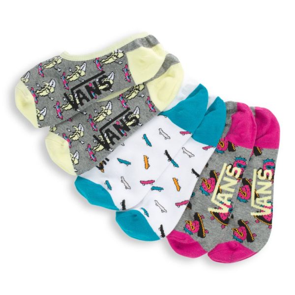 The Skate Fruit Canoodle Socks 3 Pack features three pairs of novelty canoodle socks with skateboarding fruit jacquard art. They are made with 72% cotton, 26% nylon, and 2% elastane.