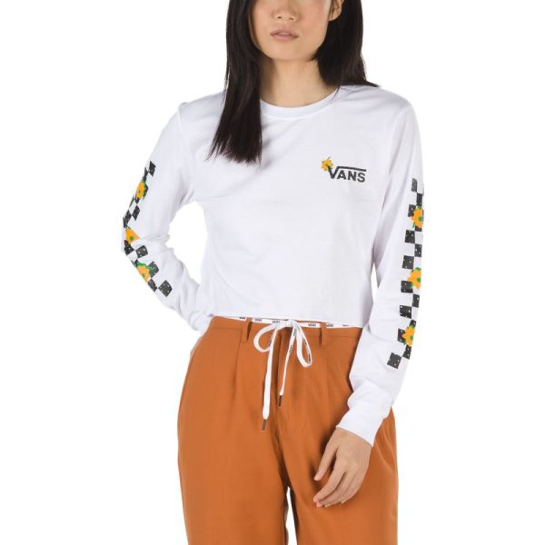 The Lepp Check T-Shirt is a 100% cotton long sleeve tee with left chest logo graphics, checkerboard and floral graphics at the sleeves, and a cropped fit. Model is 5 feet 9 inches tall and wearing a size Small.