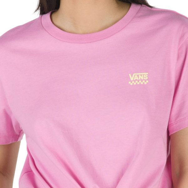 The Tie Knot Boyfriend Tee is a 100% cotton t-shirt featuring a front knot, left chest logo graphics, and a boyfriend fit. Model is 5 feet 9 inches tall and wearing a size Small.