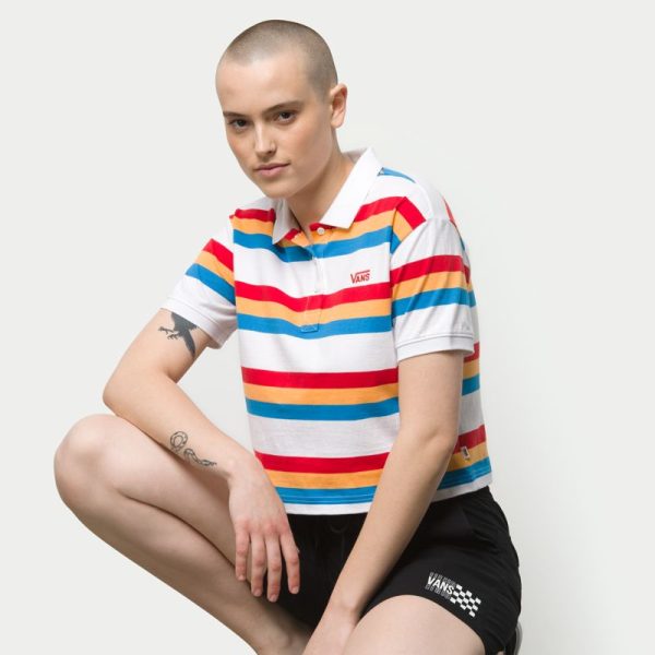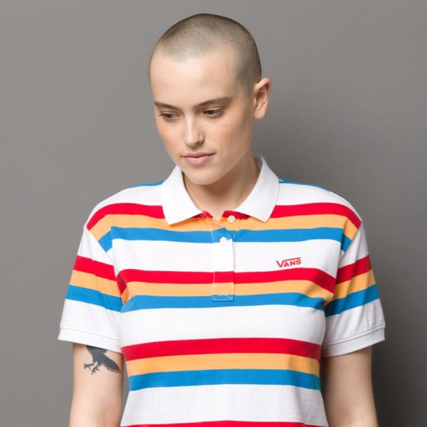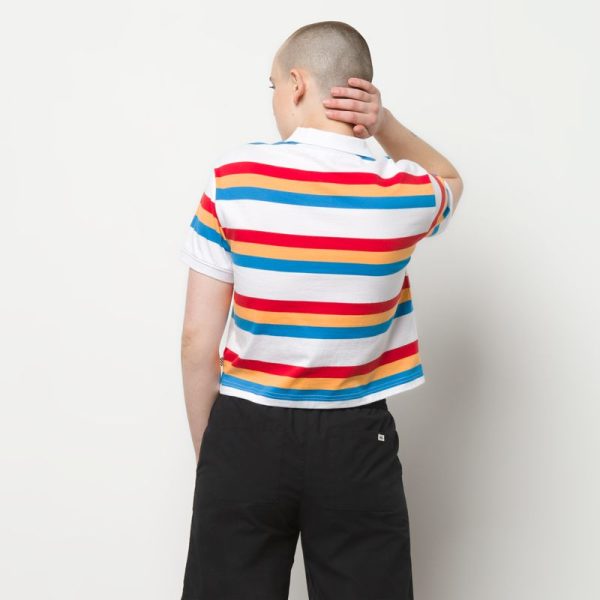 The Long Haul Polo Shirt is a 100% cotton polo shirt with short sleeves, yarn dyed stripes, and contrast ribbing. It also features embroidery at the chest and a boxy, cropped fit. Model is 5 feet 9 inches tall and wearing a size Small.