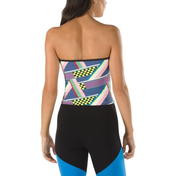 The Ramp Tested Tube Top is a 95% cotton, 5% elastane fitted tube top with an allover print, contrast binding, interior front lining, and a front logo screen print. Model is 5 feet 9 inches tall and wearing a size Small.